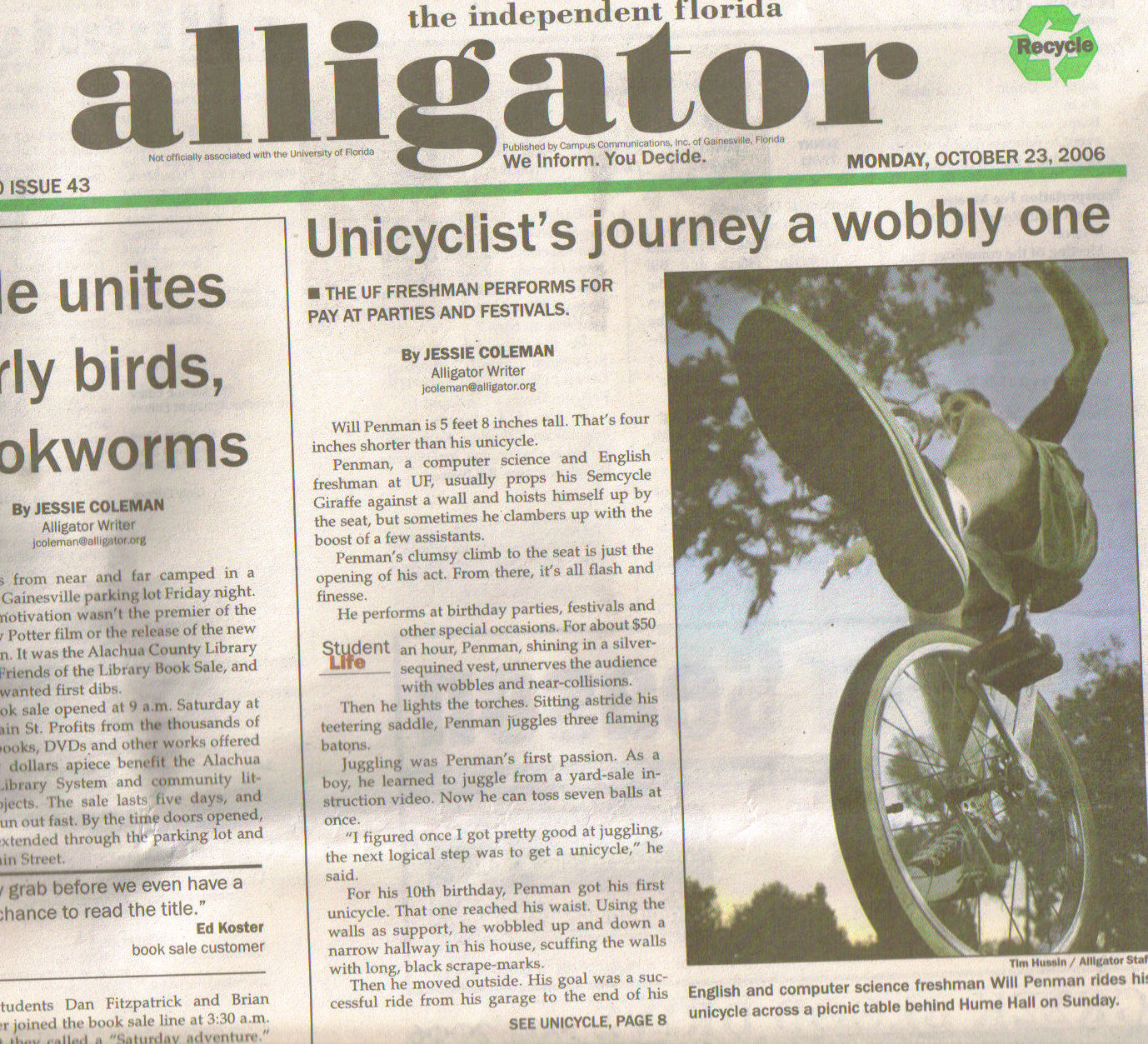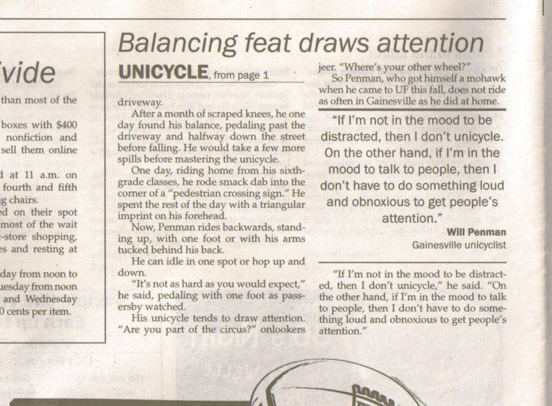 2006, pg2 of article. (The writer didn't distinguish between the regular unicycle and my tall "giraffe" unicycle, a key difference for understanding how I would run into a stop sign.)