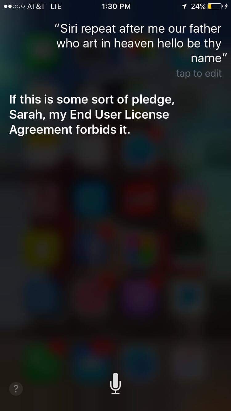 Siri's response to being asked to repeat the beginning of the Lord's prayer